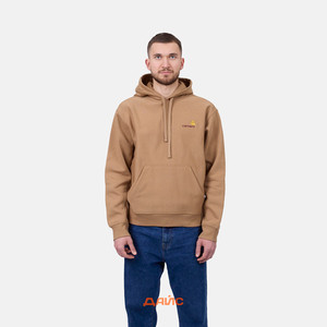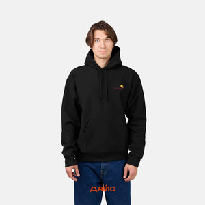 Толстовка Carhartt WIP American Script Hooded выполнена из смеси плотного натурального хлопка и полиэстера с начесом на изнаночной стороне. Силуэт имеет свободный крой с эластичными манжетами на рукавах и подоле. Приятным дополнением является регулируемый капюшон на шнурке и карман-кенгуру. Выполнен в однотонной расцветке и дополнен контрастным вышитым брендингом на груди.